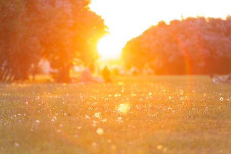 Sunset in the park with lush greenery. Summer evening outdoors. People are enjoying the sunset. People are sitting on the lawn. Warm summer evening. Sunshine. Copy space.