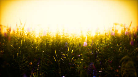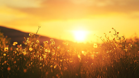 A captivating view of a field bathed in the golden glow of sunset. The sun's rays illuminate the tall grass and wildflowers, creating a vibrant and ethereal scene.