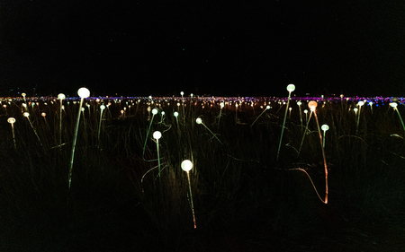 A vibrant tree is lit up, casting a soft glow on the ground, creating a tranquil nighttime ambiance for viewers.