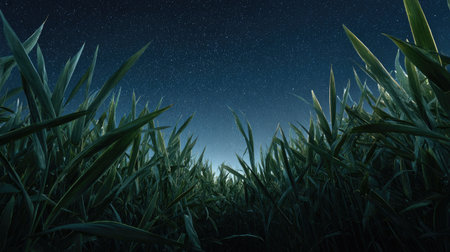 A panoramic wide view of a field growing closely together under a clear night sky starlight illuminating leaves soft shadows calm natural atmosphere ultra realistic photography cinematic wide composition lifelike natural scene