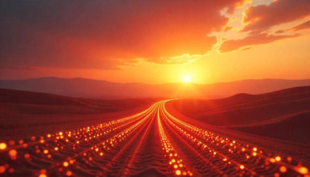 Panoramic sunset and clouds over a wheat field with a path to the horizon panorama web banner header
