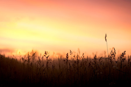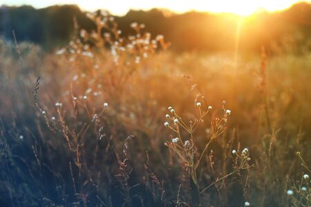 Field plants at sunset. The sun sets below the horizon creating contrasting combinations of herbs and plants.