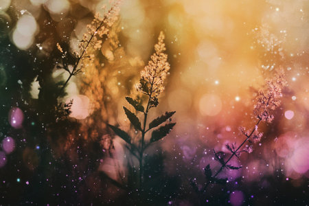 View showing sunbeams shining through wild grass and flowers keywords: sunbeams, sunlight, sun rays, golden hour, bokeh, light, nature, meadow, grass, wildflowers, plants, summer, morning, evening, bright, warm, glow, lens flare, atmospheric, vibrant, natural, beauty, outdoor, field, growth, delicate, serene, peaceful, backlit, illumination description: golden sunbeams stream diagonally across a close-up view of a field of wild grass and small flowers. the bright sunlight creates a strong...