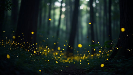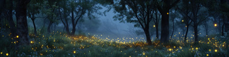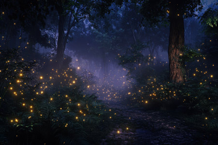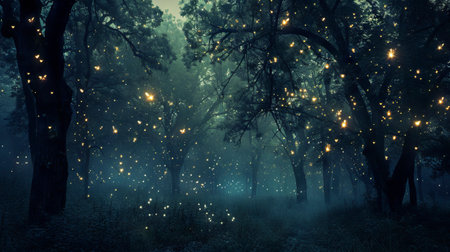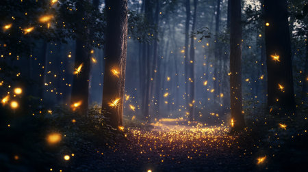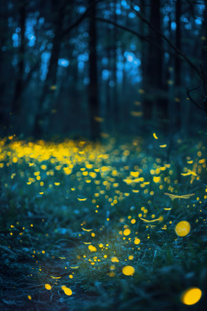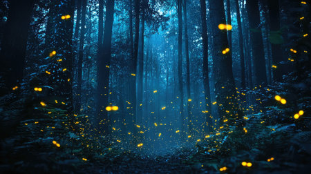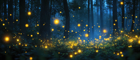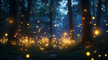 A mesmerizing scene showcasing glowing fireflies illuminating a serene forest landscape during twilight. Ideal for nature and magic-themed projects.