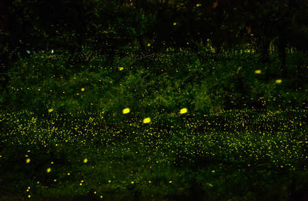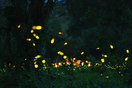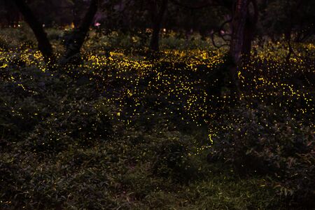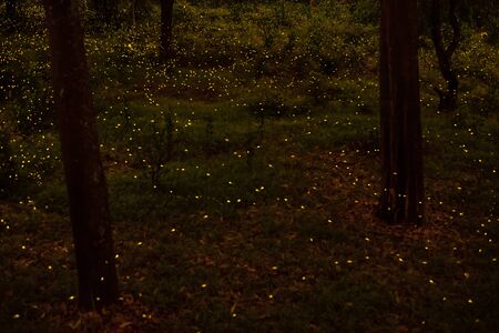 Abstract and magical image of Many firefly flying in the forest. Fireflies in the bush at night in Bangkok (Prachinburi) Thailand. Firefly symbolizes the integrity of the ecosystem. Long exposure photo.