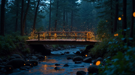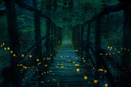 Fireflies flying over a wooden bridge in the forest at twilight.
