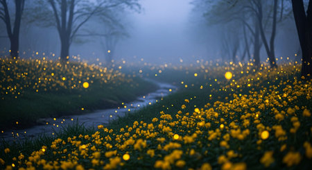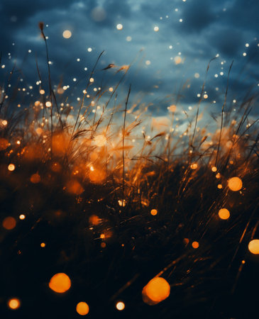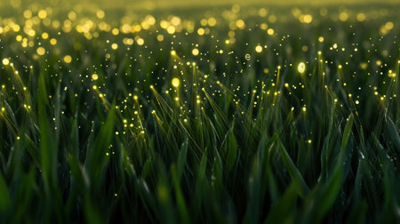 Enchanting image of vibrant green grass illuminated by sparkling fireflies at twilight, evoking a sense of magic and tranquility in a serene natural setting.