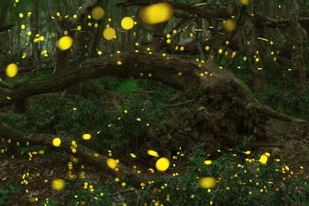 Fireflies shine bright in the rainforest at night time, a beautiful night in the rainy season. yellow light bokeh