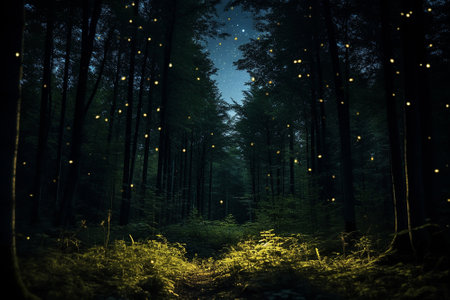 Amidst a Shadowy Forest, Luciferin-Infused Fire Bugs Glimmer Resembling Stars.