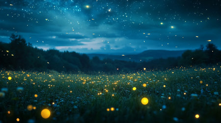 A serene night scene showcasing glowing fireflies in a grassy field under a starry sky. The tranquil landscape evokes a sense of wonder and magic.