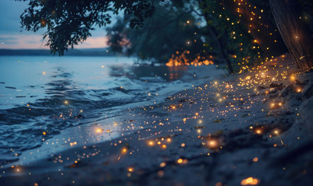 As twilight settles, the riverbank glows with fireflies, creating a magical atmosphere. The calm water reflects the fading light while trees frame the peaceful view.