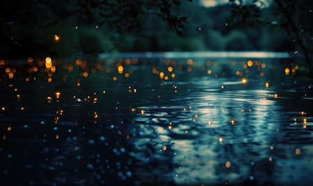 Generative AI Image of River Water with Fireflies and Butterfly Insect Flying in Night Sky