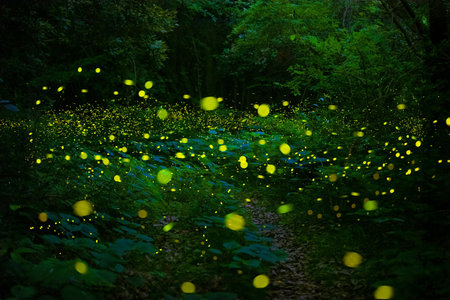 In Gotjawal Forest, a famous tourist attraction on Jeju Island, South Korea, fireflies create a wonderful scenery with beautiful lights.