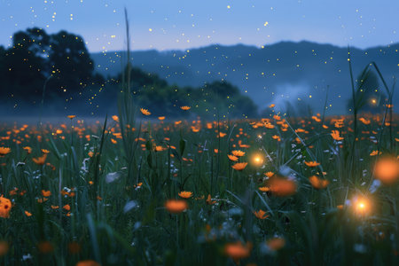 Enchanting Twilight Meadow with Glowing Fireflies - Natures Magical Evening Scene for Wall Art