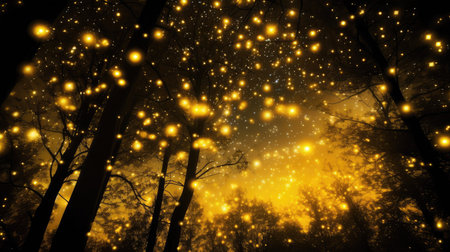 A serene and enchanting scene of numerous fireflies illuminating the dark night sky, creating a mesmerizing display of twinkling lights.