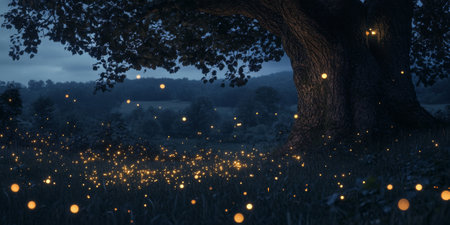 A twilight scene with fireflies dancing around an old tree, representing fleeting moments in a magical setting