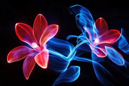 Abstract neon flower with glowing blue and red petals swirling in dynamic light wave pattern on dark background. Futuristic botanical design concept