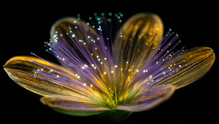 Illuminated flower with fiber optics, glowing petals, and vibrant center, against dark background