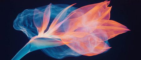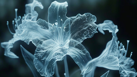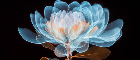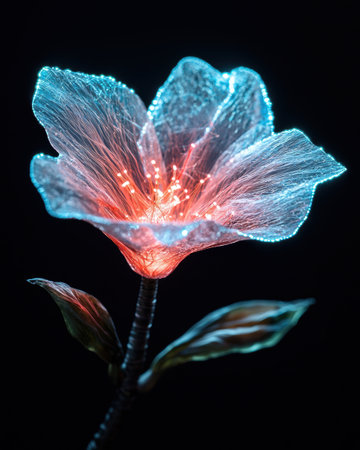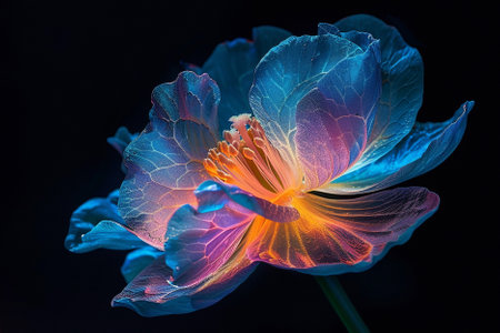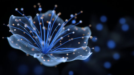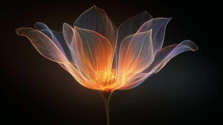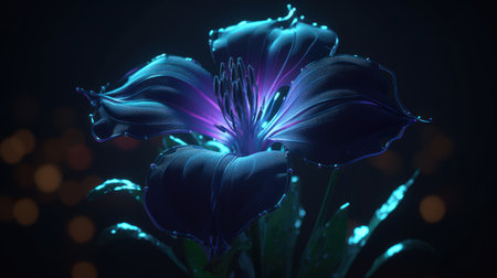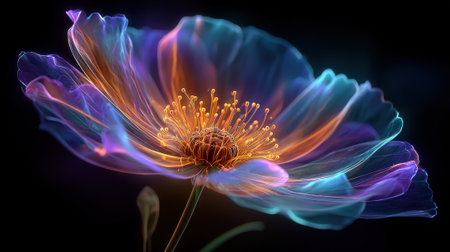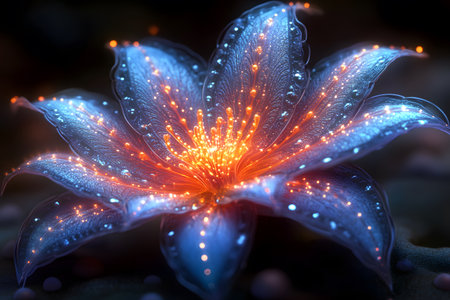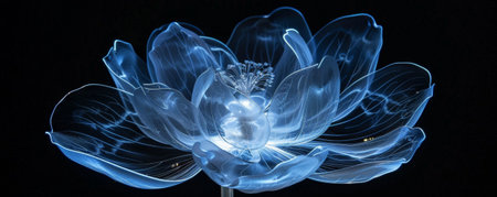 A stunning representation of a transparent flower with blue petals and glowing stamen, captured against a dark background, ideal for artistic and creative projects.