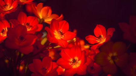 A stunning close-up of vibrant flowers adorned with dew drops, glowing beautifully at night. This artistic portrayal highlights nature's delicate charm.