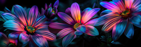 Neon flowers on a black background. 3D rendering. Neon flowers.