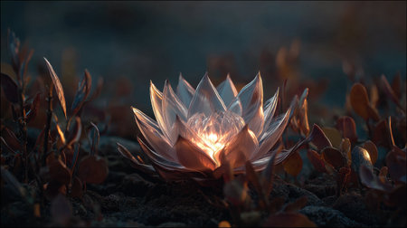 Beautiful glowing flower emerges from ground, surrounded by small plants and foliage. delicate petals reflect light, creating serene and enchanting atmosphere
