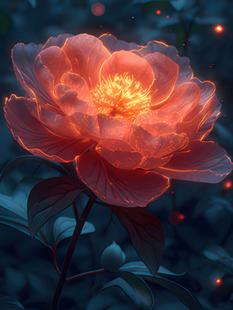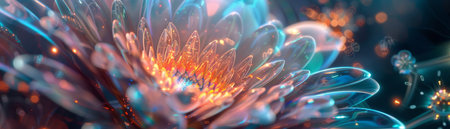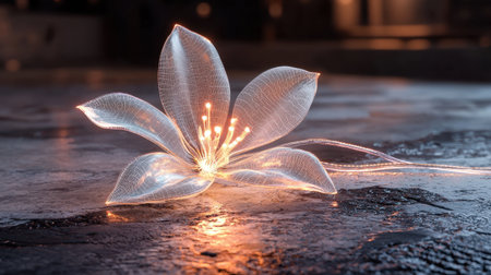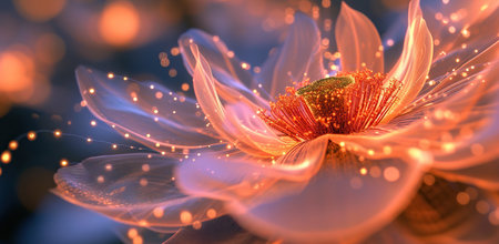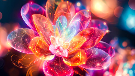 A fantasy flower with glowing petals and shimmering sparkles. Light reflections create a mesmerizing, magical effect
