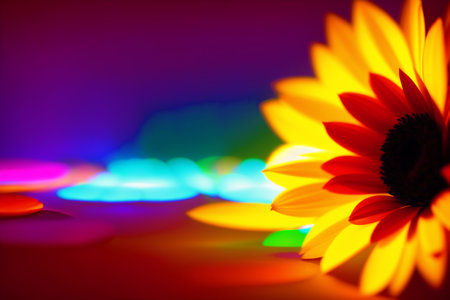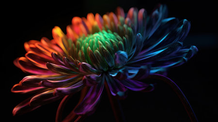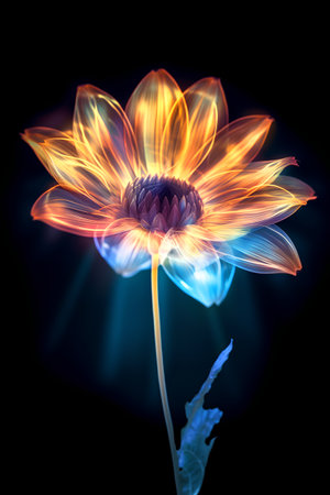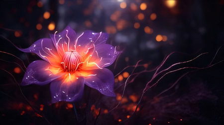 Radiant flower with luminescent petals and vibrant central glow, set against a dark background. this futuristic depiction combines elements of nature and technology, perfect for modern design concepts. Generative AI