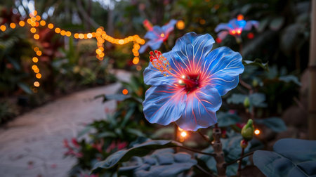 Two vibrant blue flowers with radiant centers are the focal point of this image. Set against a backdrop of dark green leaves and a blurred, dark environment, the composition is striking. The lighting appears magical, suggesting a nighttime scene. Suitable for a range of creative projects.