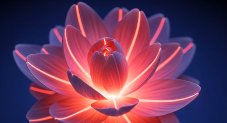 A close-up view of a radiant pink lotus flower against a dark blue background. The petals are illuminated from within, and prominent, glowing neon lines in shades of red and orange trace the veins and edges of each petal. The light emanates strongly from the center of the bloom, creating a striking visual effect. This digital render emphasizes the intricate details and luminous, almost electric, of the floral form.