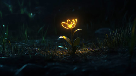 A captivating glowing flower emerges from the dark ground, showcasing its beauty amidst the shadows. This enchanting scene evokes a sense of tranquility and wonder in nature.