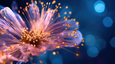 Flower with a glittering center and glowing lines on a dark blue background. The concept of the beauty of nature and sparkle.