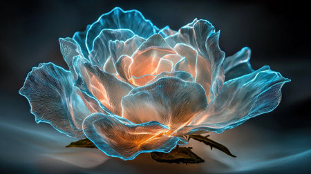 A transparent glass flower with neon azure light outlining its petals. The cool, vibrant glow enhances the ethereal beauty of the flower, creating a captivating effect.