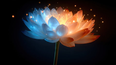 An illuminated lotus flower presents a symmetrical composition with contrasting blue and orange hues. The petals feature soft gradients with a subtle glow, complemented by floating particles. Set against a dark backdrop, the artwork has a digital art style. This image is suitable for various editorial and commercial applications.