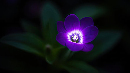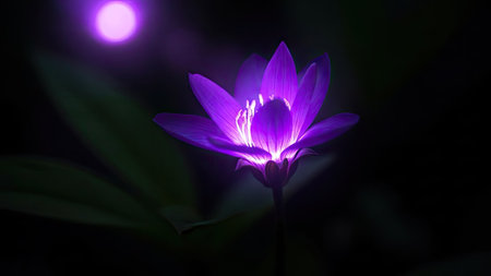 A close-up captures a luminous purple flower, its center brightly illuminated against a dark backdrop. The image showcases textures, with the flower's petals and the surrounding leaves. The lighting creates a dramatic contrast, highlighting the flower. Suitable for various editorial and commercial applications.