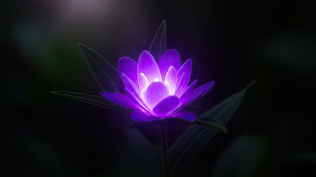 A close-up view displays a luminous purple lotus flower illuminated against a dark backdrop. The image reveals the intricate details of the flower's petals and center. The style features a dramatic contrast between light and shadow. Suitable for various applications including artistic projects, and editorial content.