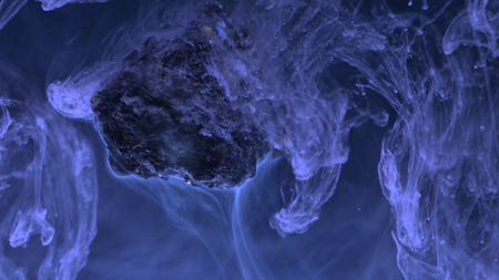 Fluid splash. Paint flow. Defocused cold blue color glowing acrylic ink water emulsion spill wave creative abstract art background.