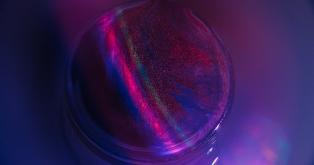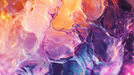 Iridescent glow background. Neon glitter fluid. Dreamlike illusion. Fluorescent pink purple blue color shiny ink water splash on ice cube on mist cloud abstract texture.