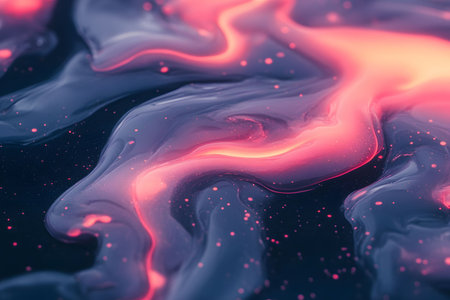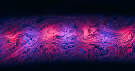 A close-up view of a dark, viscous liquid surface with swirling patterns and vibrant neon pink and blue reflections, showing small air bubbles.