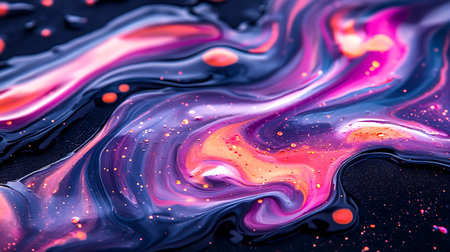 Fabulous paint flow. Gasoline texture. Pink purple color ink soap stream art light reflection. Dye mix defocused abstract black background.
