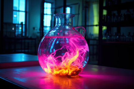 Captivating image of a colorful chemical experiment in a glass flask on a lab bench