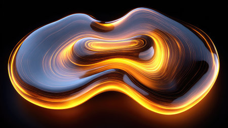 An abstract visual showcases a flowing, amorphous form in luminous colors. The image uses blended hues of gold and blue with dynamic line patterns suggesting movement. The composition features high contrast against a black background, with strong lighting effects. Suitable for various design applications.