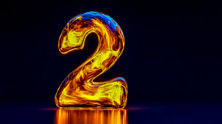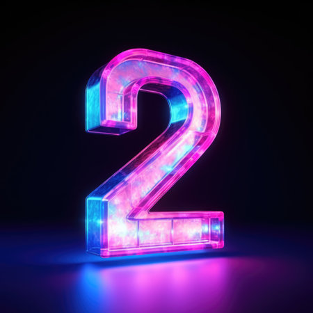 3d rendering. A glowing neon number two in vibrant colors of pink, blue, and orange, set against a dark background with blurry floor reflection