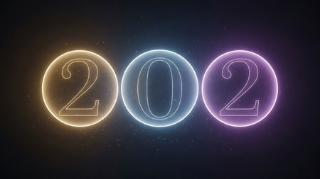 Three luminous 2022 digits in gold, blue, and purple neon glow, suspended in deep cosmic space with twinkling stars, futuristic celebration theme for new year or tech events.