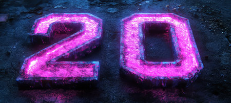 Glowing Number 20, Twenty, Made of Stone and Pink Neon Light on a Dark Grunge Background