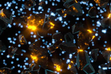 Broken gravels floating on black background, 3d rendering. Computer digital drawing.