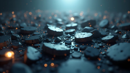 An abstract landscape with scattered rocks and glowing light points, forming a mysterious and ethereal atmosphere, a grainy texture adds depth and intrigue to the dreamlike scenery.
