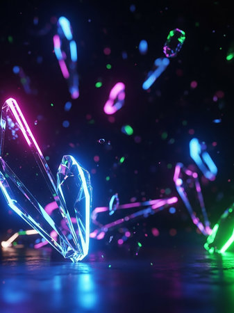 Modern showing close up of translucent geometric crystals illuminated by vibrant neon pink blue and green lights with scattered glowing particles keywords:...