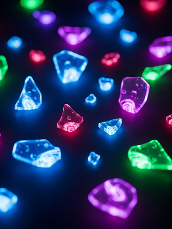 Sharp, translucent geometric crystal fragments scattered across a dark surface, illuminated from within by vibrant neon blue, pink, and green light.
