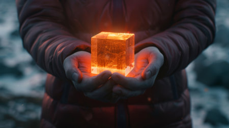 Illuminated transparent toy blocks stacked create an abstract geometric tower with warm glowing light and dark background.